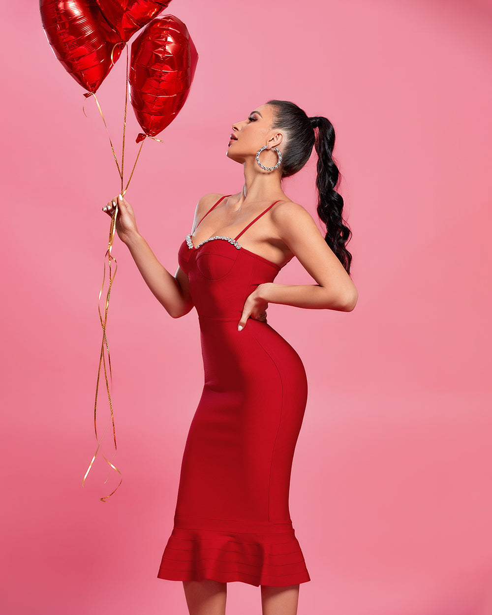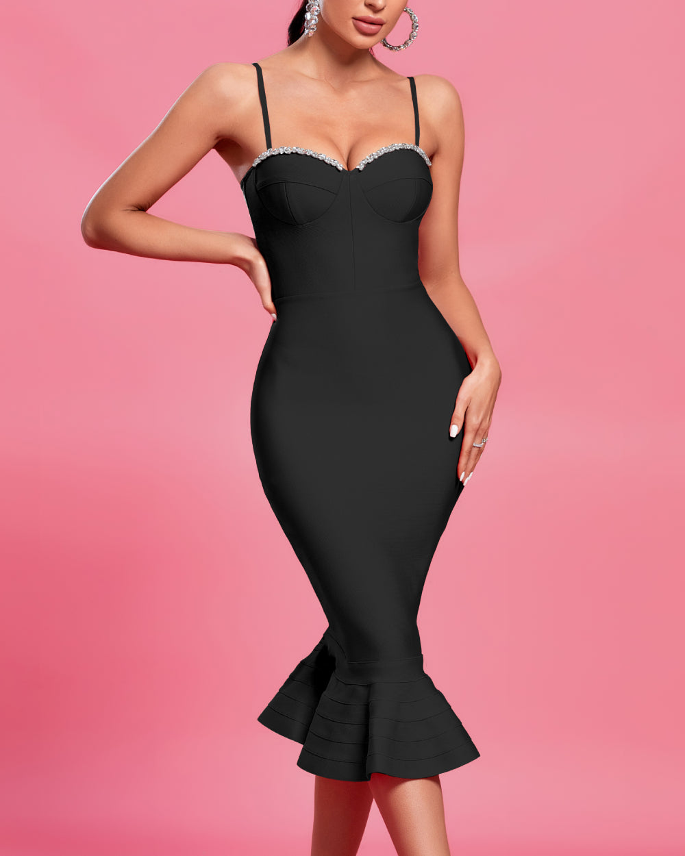 Experience effortless elegance in this Strappy Crystal Midi Fishtail Bandage Dress. Featuring intricate crystals and a luxe fishtail silhouette, this dress will make you look and feel your best. Perfect for any formal occasion, you'll sparkle like a star in this timeless, tasteful dress.