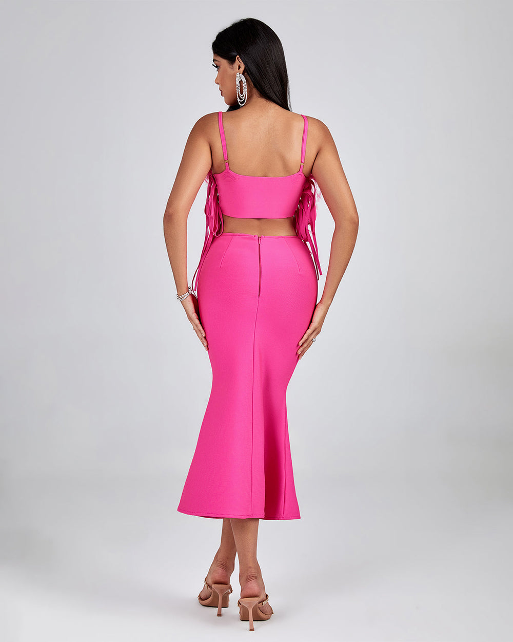 Become a fashion risk-taker with our Strappy Feather Trim Hollow Out Bandage Dress! This statement dress features a sleek strappy design to perfectly show off your daring style. Dare to be bold and take your wardrobe up a notch!