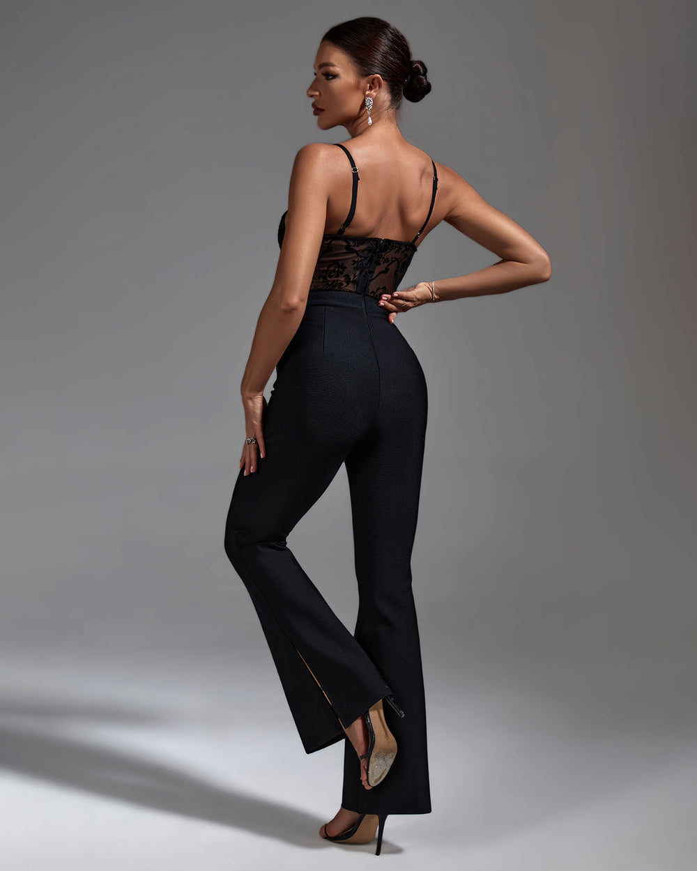 This Strappy Lace Bandage Jumpsuit adds effortless elegance to any wardrobe. Crafted from a delicate blend of lace and bandage fabric, it offers an exquisite level of comfort and style - perfect for making a sophisticated statement for any occasion.