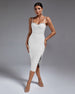 The Strappy Drill Chain Midi Bandage Dress is a statement piece that makes a glamorous impression. The feminine strappy design and midi length make for a timeless look, while the chains add a touch of edginess. Perfect for special occasions, this dress will turn heads.