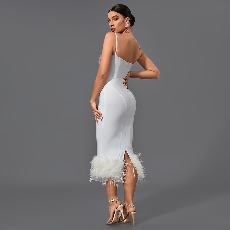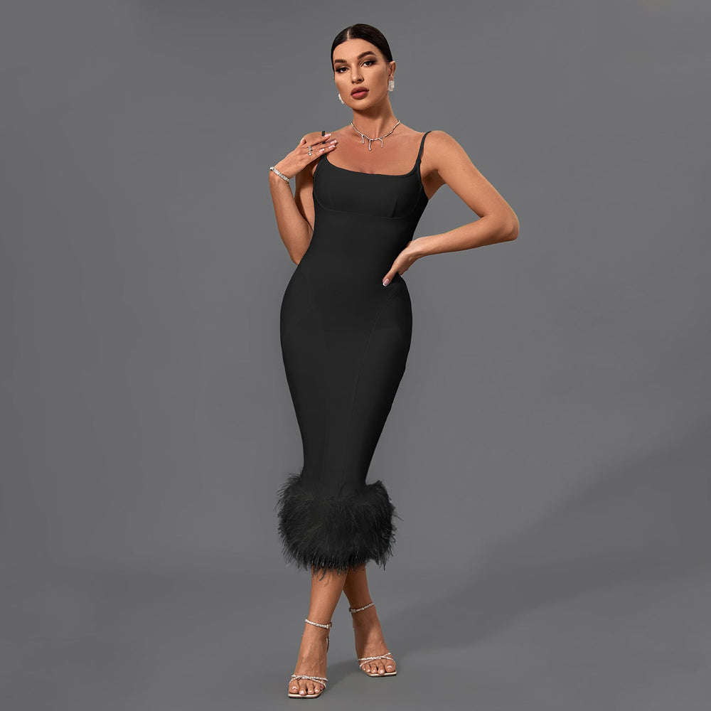 'Strappy Feather Midi Bandage Dress' falls to a flattering midi length and updates the timeless bandage dress with glamorous feathered embellishments. It has a zip to the back for easy on.