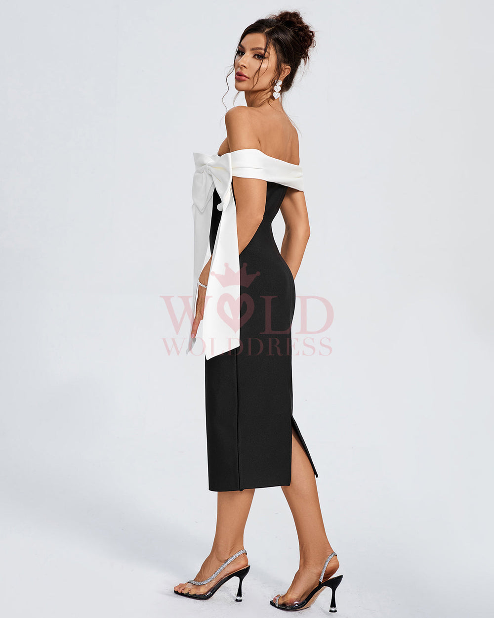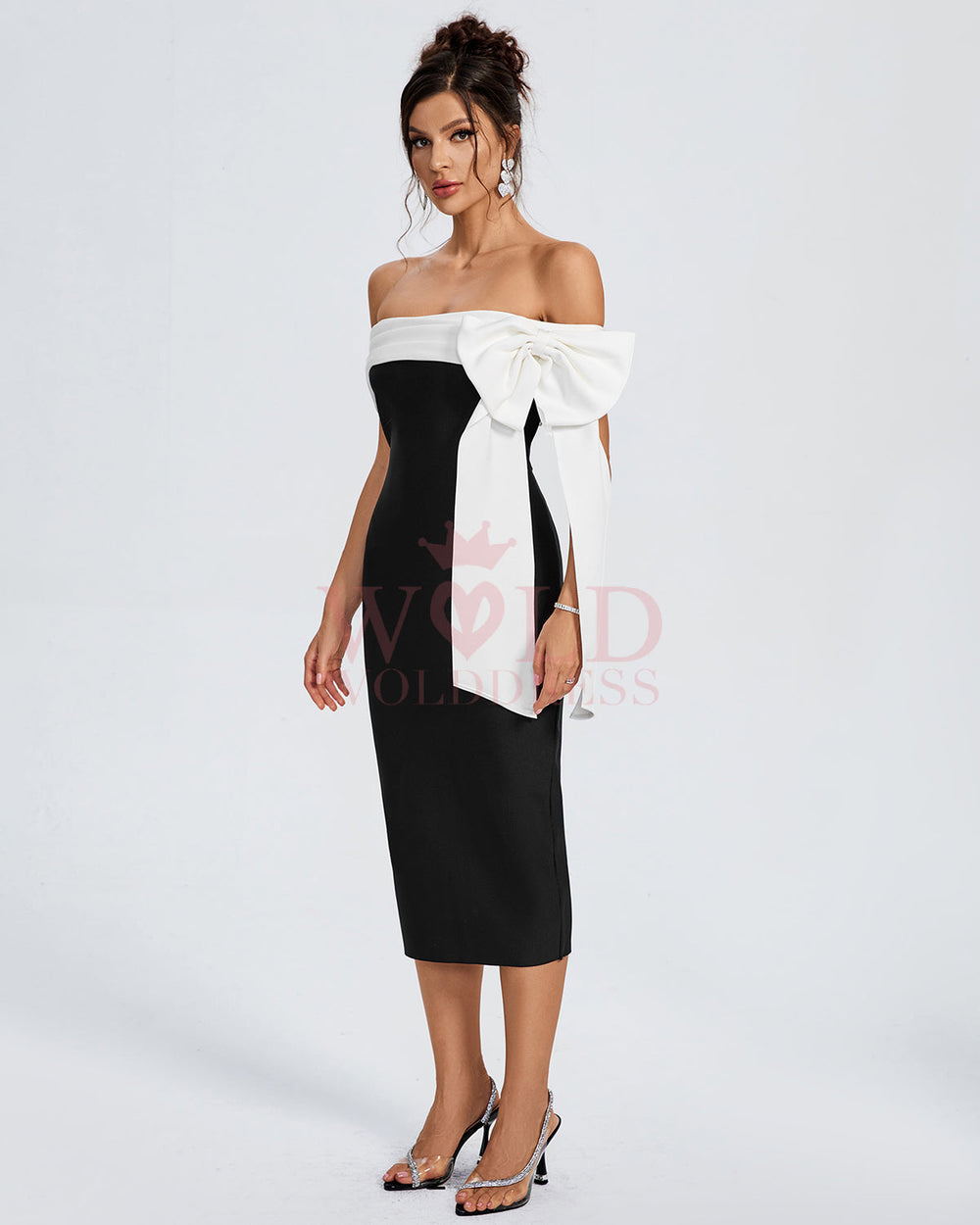 Enhance your wardrobe with our White-Bow Off Shoulder Midi Bandage Dress. This elegant dress features an off shoulder design and a delicate white bow on the neckline. Perfect for any occasion, this dress will make you feel confident and stylish.